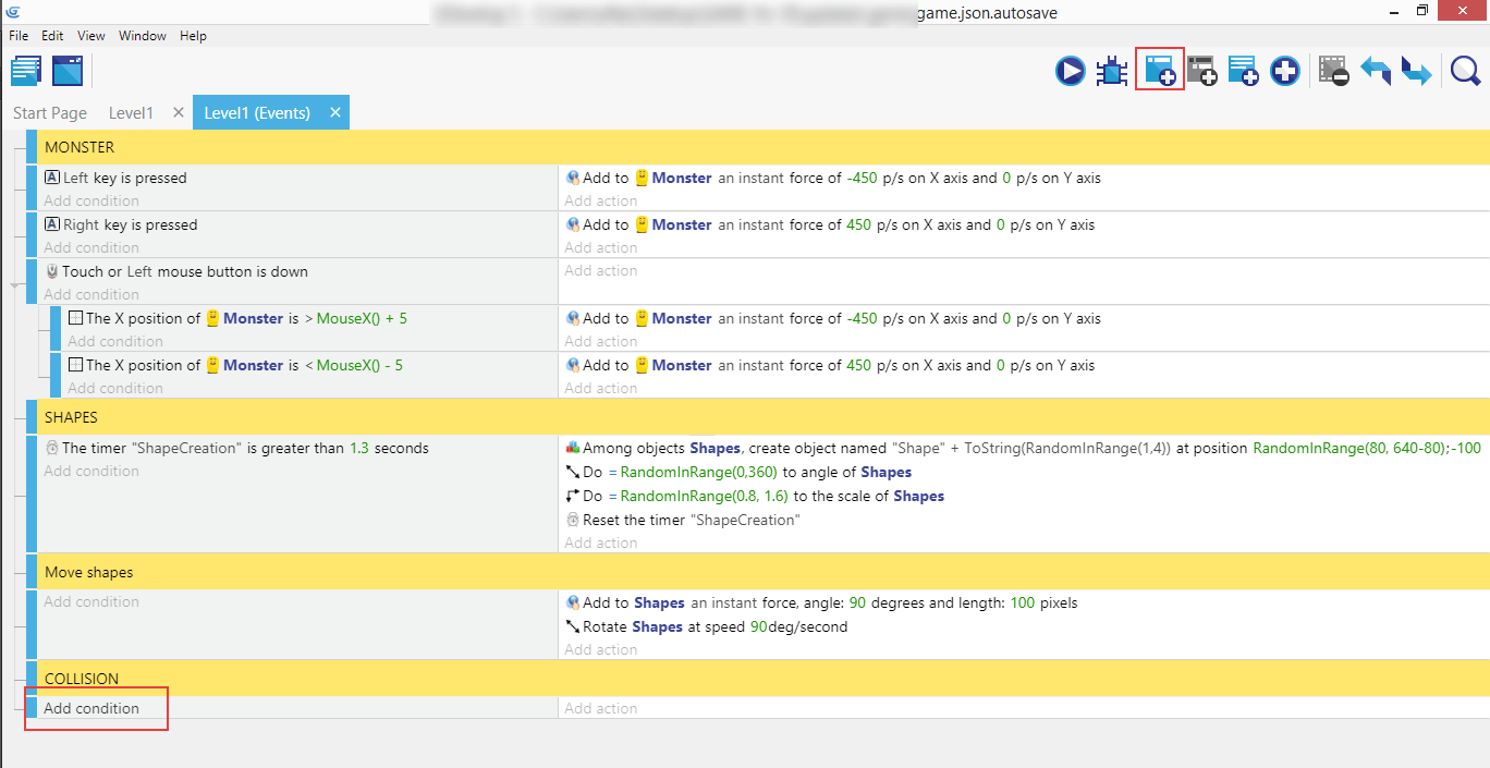 As always, make sure "Shapes" are selected, then look for "Collision" (which will test the collision between two objects). In the right panel enter the "Monster" and click "Ok".